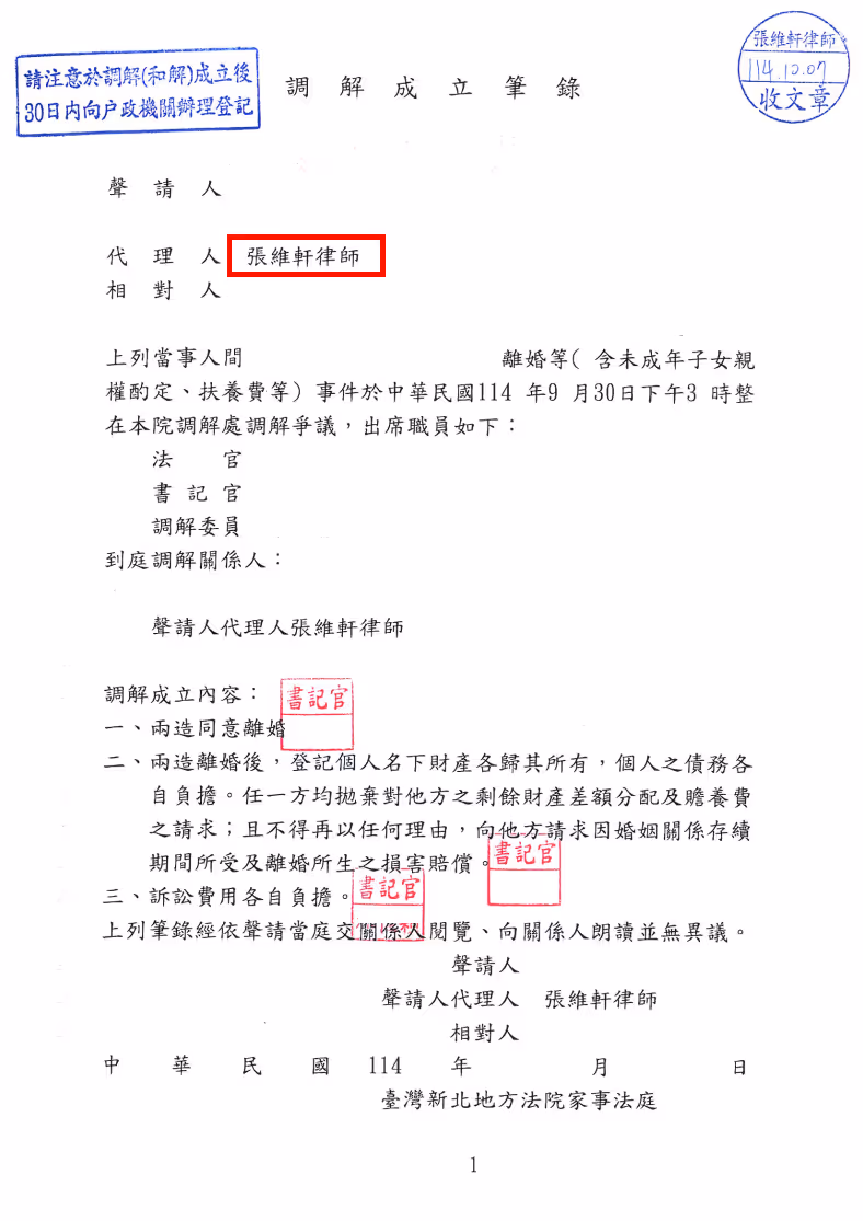 離婚、夫妻剩餘財產分配、監護權、探視權、扶養費案 - 調解成立