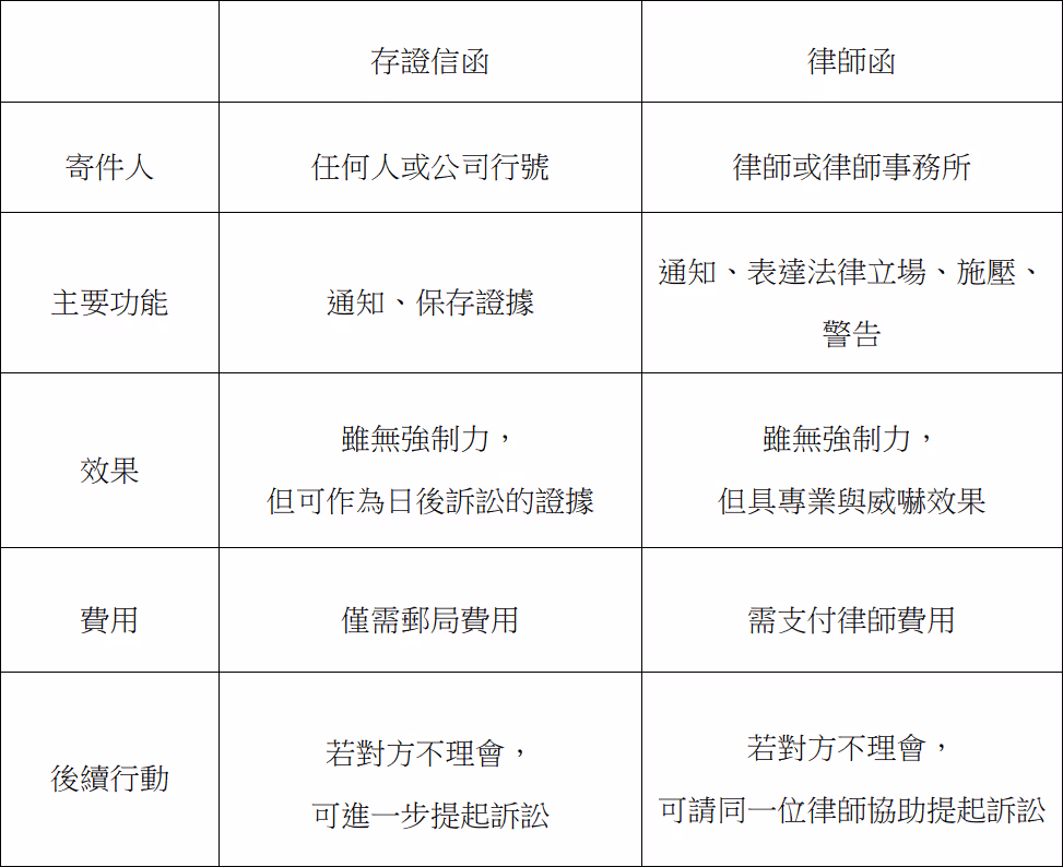 就存證信函與律師函的區別,可參考以下表格來理解: